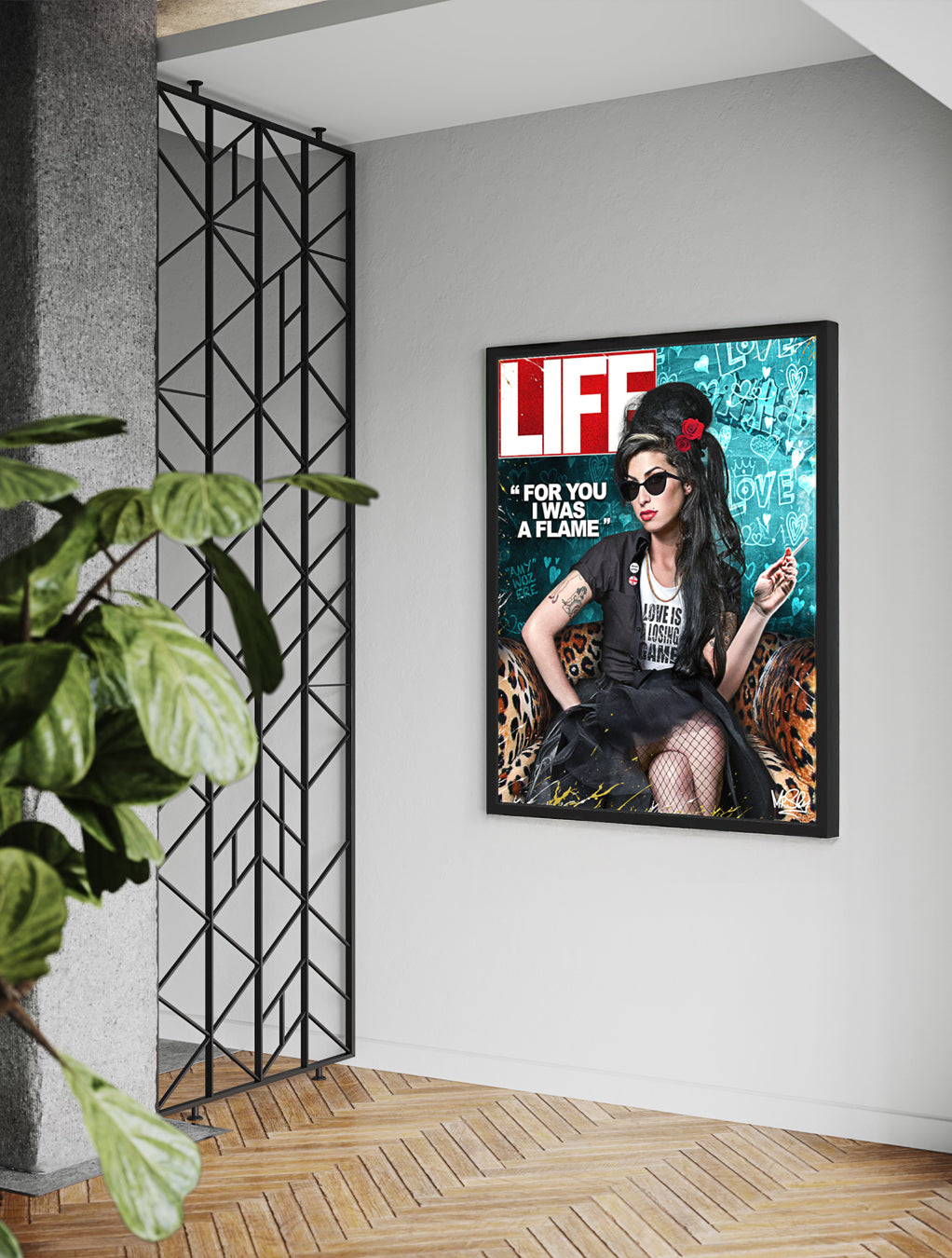 Inspired by Amy Winehouse and the iconic Back to Black album, this piece begins on a chalkboard base, layered with graffiti love symbols and hidden gems throughout.